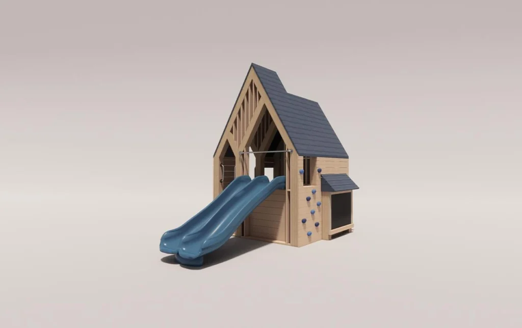 Металлический каркас обшит древесиной. Горка из пластика высокого качества. Присутствуют скаладромные зацепы.