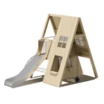 Металлический каркас обшит древесиной. Горка из пластика высокого качества. Присутствуют скаладромные зацепы.