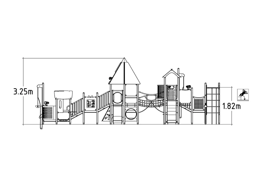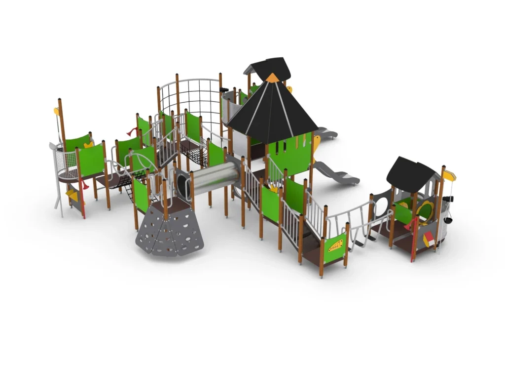 Большая игровая площадка для детей в возрасте от 3 до 11 лет, объединяющая в себе множество необходимых игровых элементов. Мостик для лазанья, сетчатые мостики и туннель для ползания — все это увлекательные испытания, которые развивают смелость и физическую активность. Игровые домики оснащены различными элементами для развития воображения, в том числе штурвалом, подзорной трубой и интерактивными игровыми панелями. Изготовлен из деревянных стоек, сосны и HDPE панелей